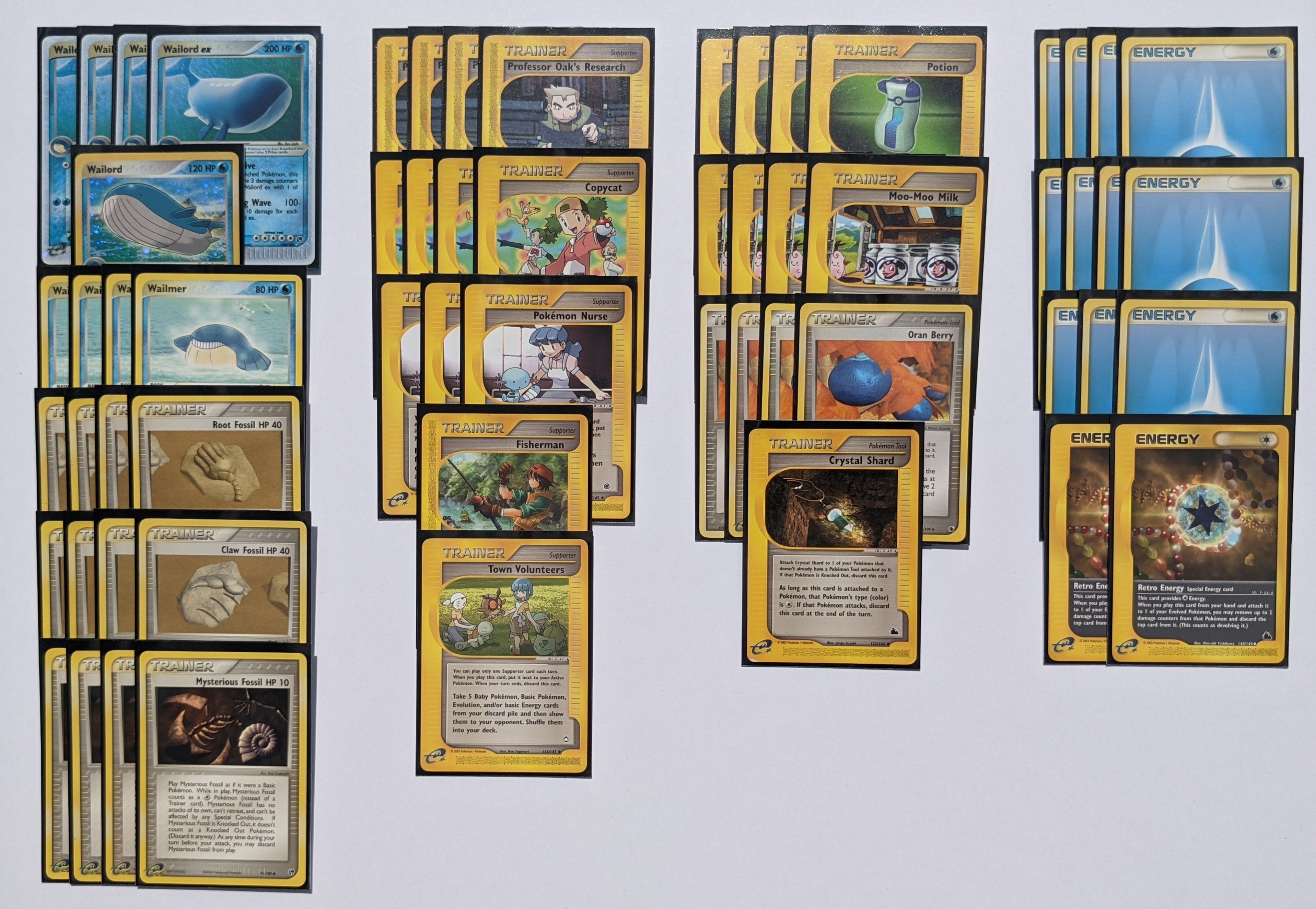 | 4x Wailord ex 1x Wailord 4x Wailmer | 4x Professor Oak’s Research 4x Copycat 3x Pokemon Nurse 1x Fisherman 1x Town Volunteers 4x Mysterious Fossil 4x Root Fossil 4x Claw Fossil 4x Potion 4x Moo Moo Milk 4x Oran Berry 1x Crystal Shard | 11x Water Energy 2x Retro Energy |