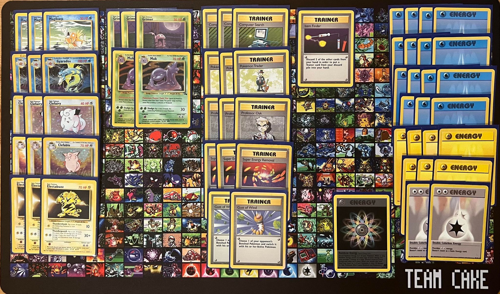| 3x Gyarados 3x Magikarp 3x Clefable 3x Clefairy 2x Muk 3x Grimer 3x Electabuzz | 3x Computer Search 3x Pokémon Trader 3x Professor Oak 3x Super Energy Removal 2x Gust of Wind 1x Item Finder | 15x Water Energy 7x Lightning Energy 2x Double Colorless Energy 1x Rainbow Energy |