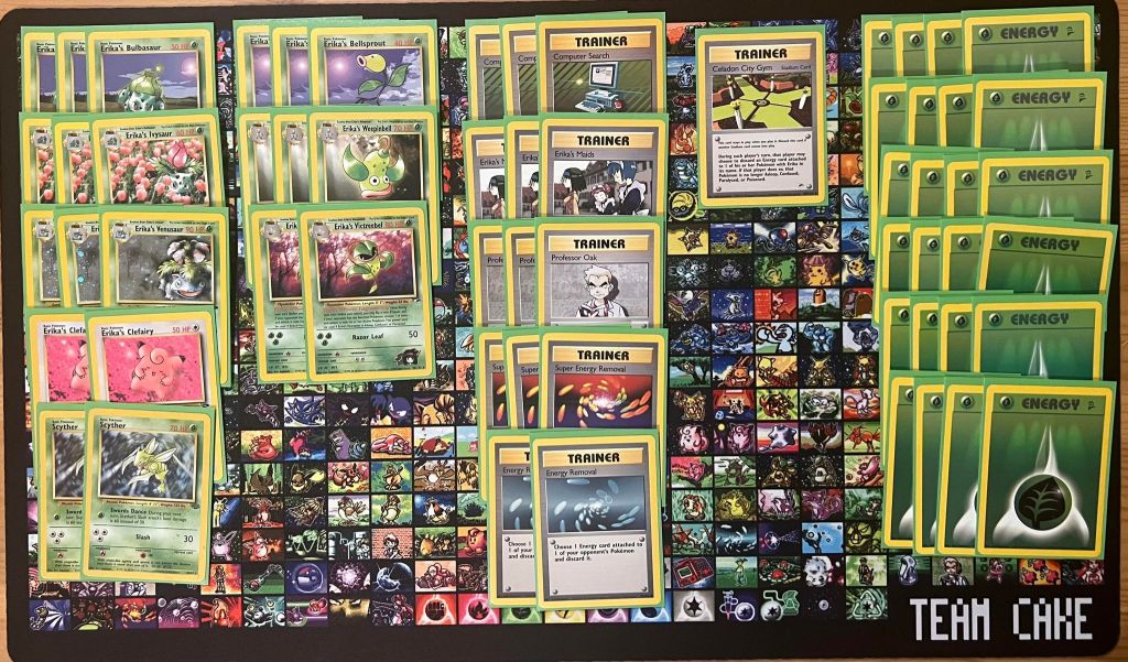 | 3x Erika’s Venusaur 3x Erika’s Ivysaur 3x Erika’s Bulbasaur 2x Erika’s Victreebel 3x Erika’s Weepinbell 3x Erika’s Bellsprout 2x Erika’s Clefairy 2x Scyther | 3x Computer Search 3x Erika’s Maids 3x Professor Oak 3x Super Energy Removal 2x Energy Removal 1x Celadon City Gym | 24x Grass Energy |