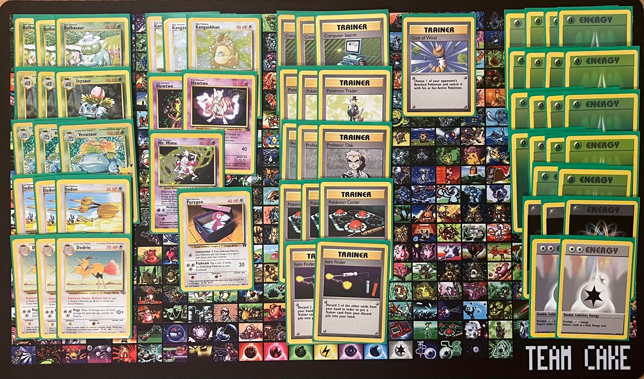 | 3x Venusaur 3x Ivysaur 3x Bulbasaur 3x Dodrio 3x Doduo 3x Kangaskhan 2x Mewtwo 1x Mr. Mime 1x Porygon | 3x Computer Search 3x Pokémon Trader 3x Professor Oak 3x Pokémon Center 2x Item Finder 1x Gust of Wind | 18x Grass Energy 3x Rainbow Energy 2x Double Colorless Energy |