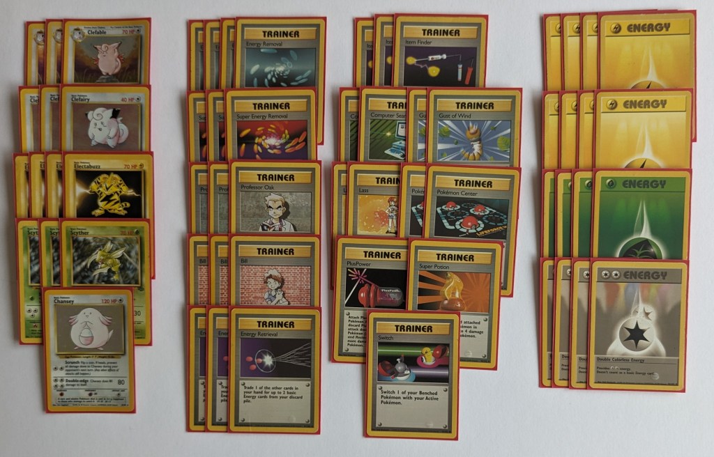 | 4x Electabuzz 3x Scyther 3x Clefable 3x Clefairy 1x Chansey | 4x Energy Removal 3x Super Energy Removal 3x Professor Oak 3x Bill 3x Energy Retrieval 3x Item Finder 2x Computer Search 2x Gust of Wind 2x Lass 2x Pokemon Center 1x Pluspower 1x Super Potion 1x Switch | 8x Lightning Energy 4x Grass Energy 4x Double Colorless Energy |